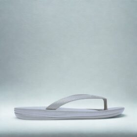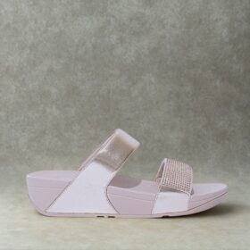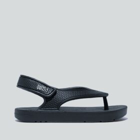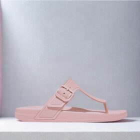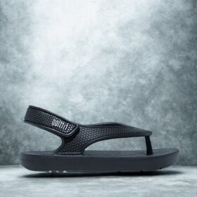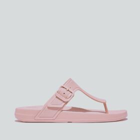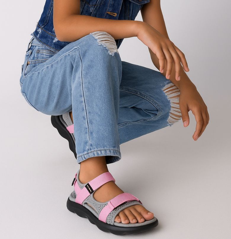 A sporty open-toe sandal with pink adjustable straps, a gray cushioned mesh footbed, and a sturdy black rubber sole — blending comfort, durability, and playful style.