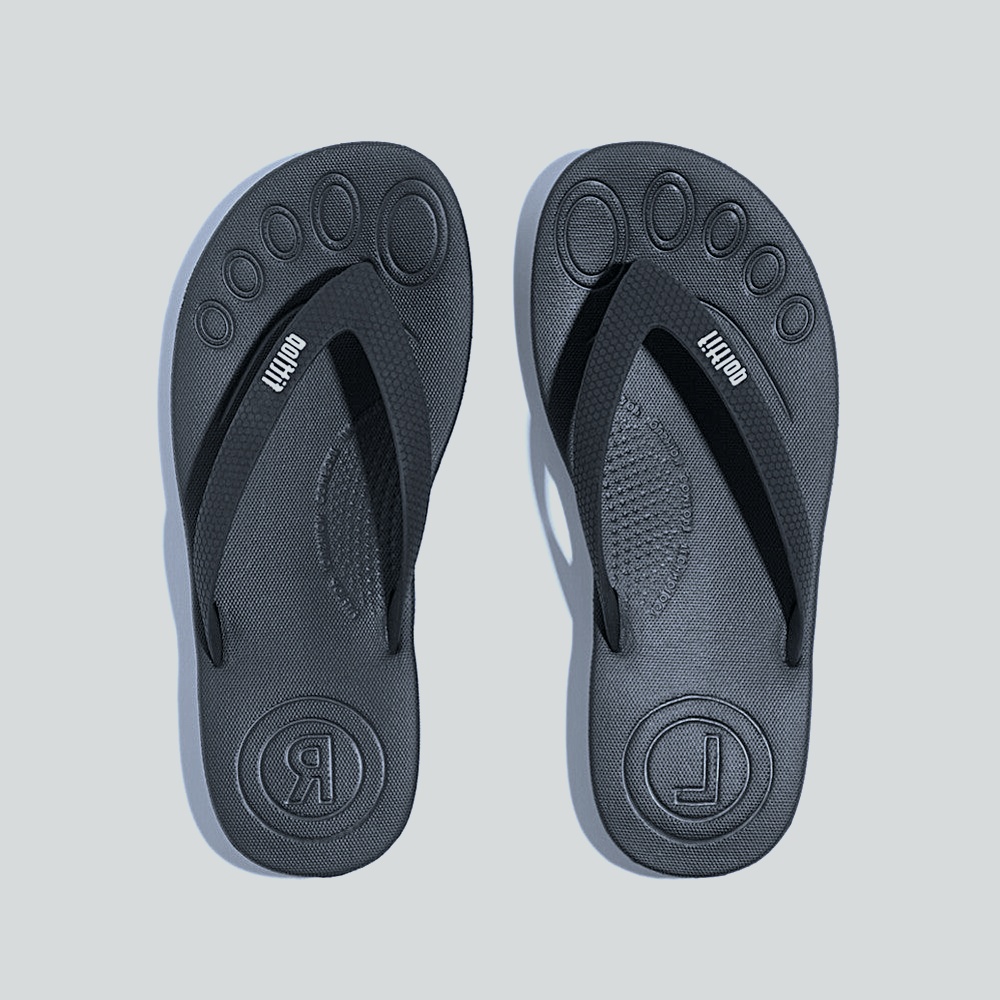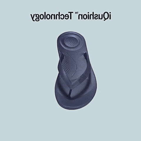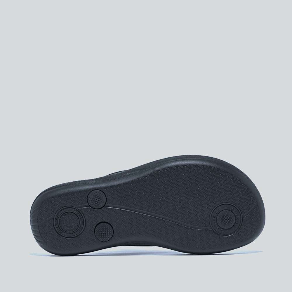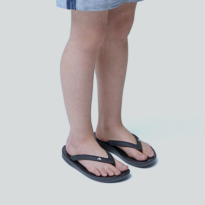 Slim V-strap flip-flops with a PebblePop strap and soft toe post. Ultra-light iQushion™ footbed cushions little feet with heel/forefoot “pillows” and natural arch support. Quick-dry build handles splash time; non-marking micro-grip outsole keeps steps steady. Finished in storm black.