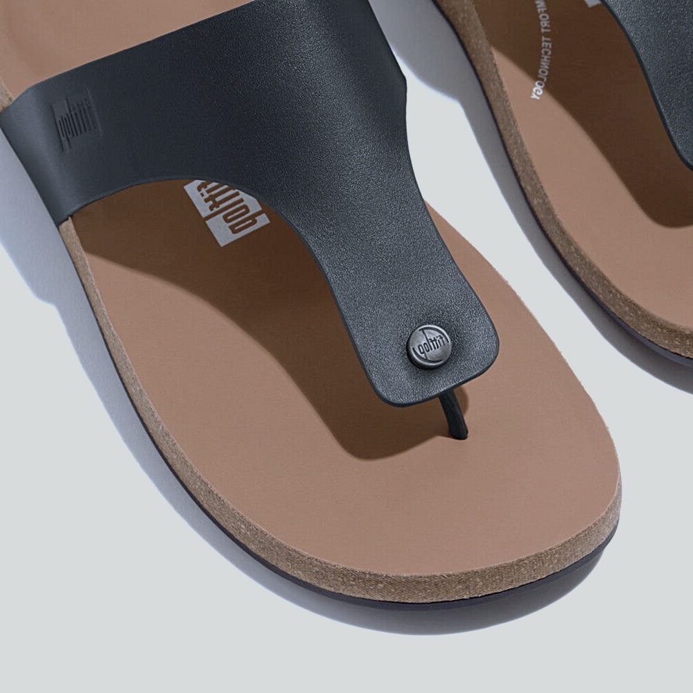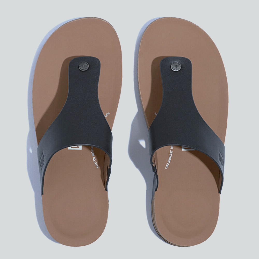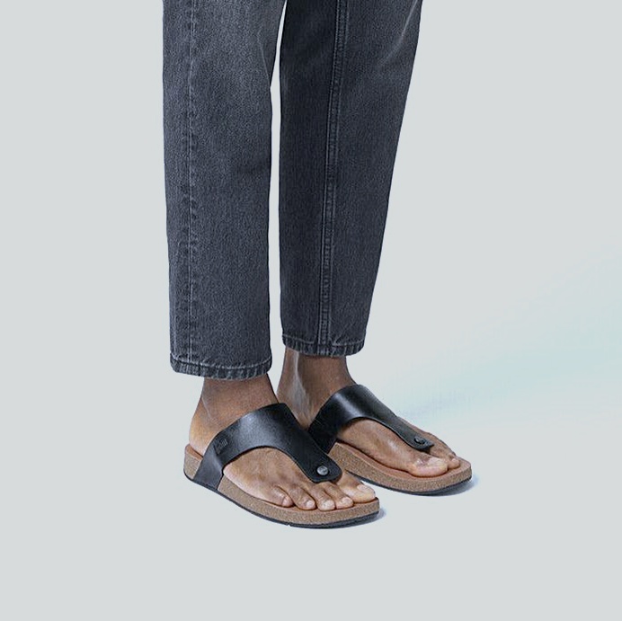 Minimalist T-strap toe-post with a sculpted single-piece upper for a clean look. TerraCork-wrap platform feels light yet steady, with a contoured footbed that cradles the arch and cushions impact. Gentle toe post and smooth edges prevent rubs; micro-grip rubber outsole keeps traction dialed. Finished in ink black.