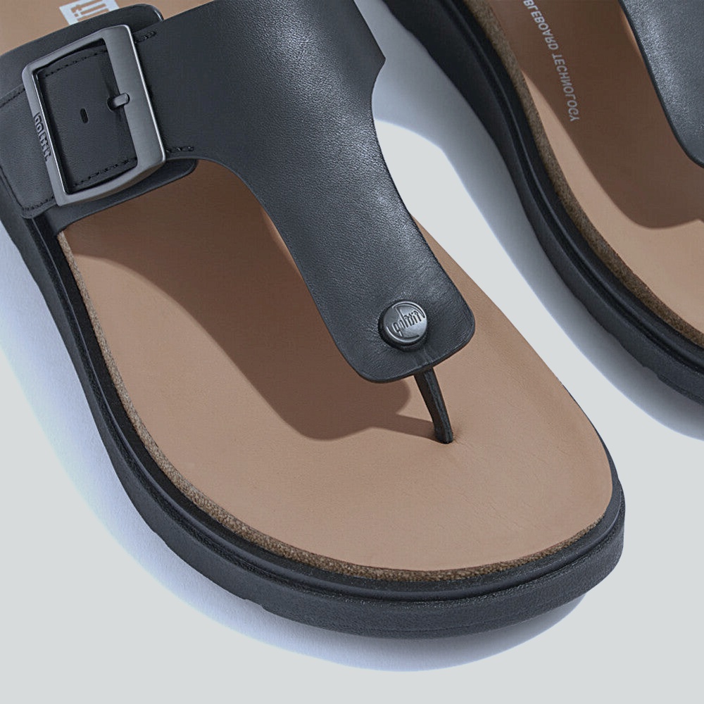 T-strap toe-post with a wide adjustable buckle for a dialed-in fit. TerraCork footbed contours to the arch and softens impact, set on a lightweight LiftWave platform for steady height without bulk. Smooth edges and a gentle toe post prevent rubs; padded instep strap adds comfort on long walks. GripFlex rubber outsole delivers confident traction in midnight black.