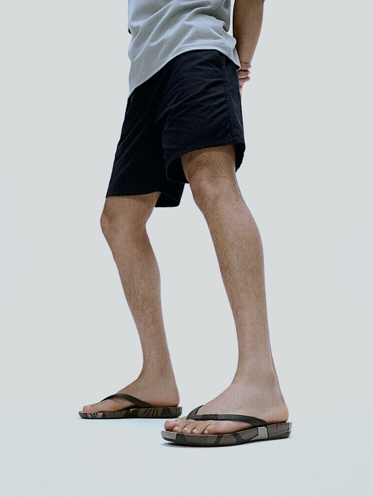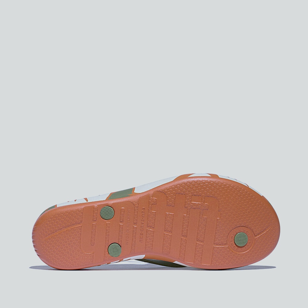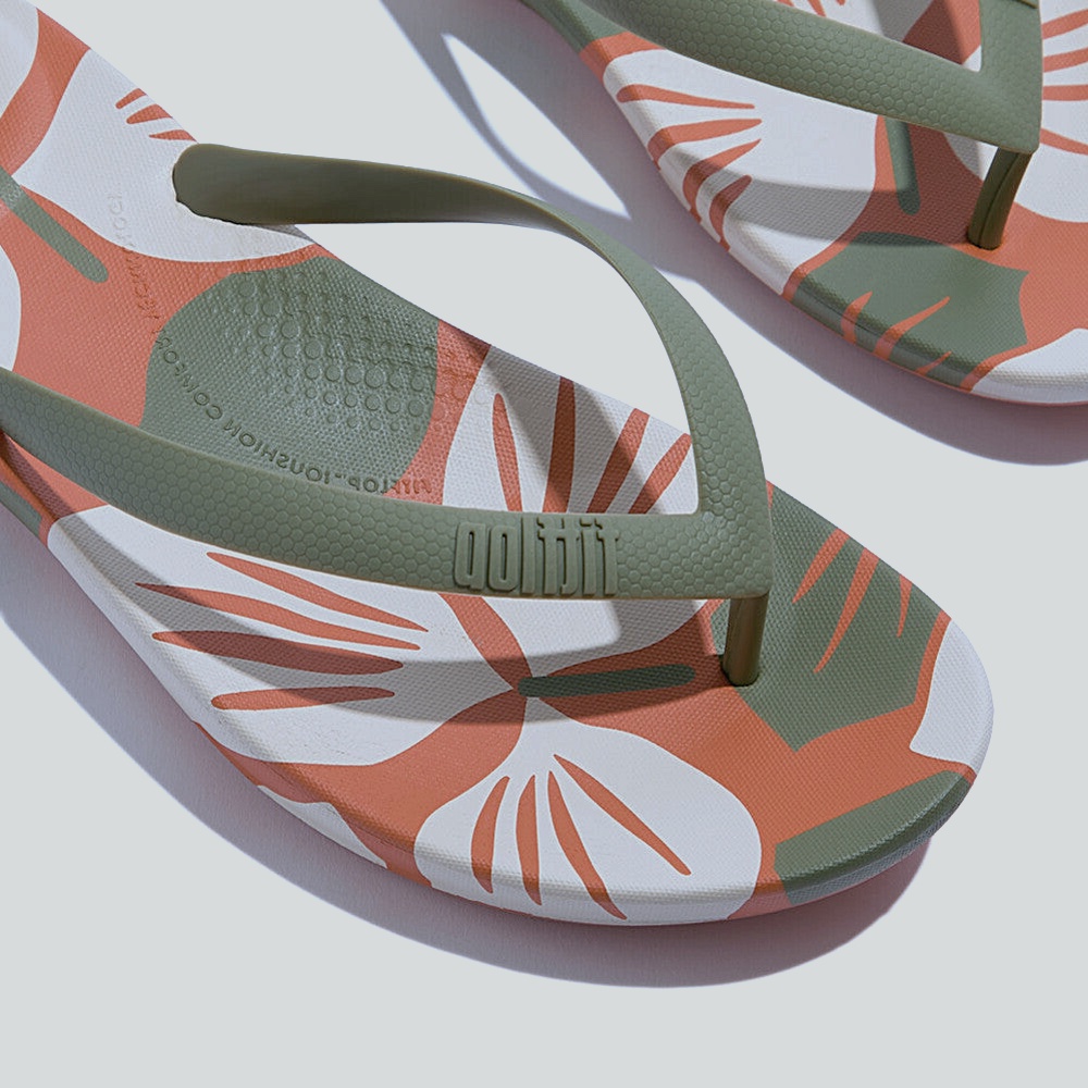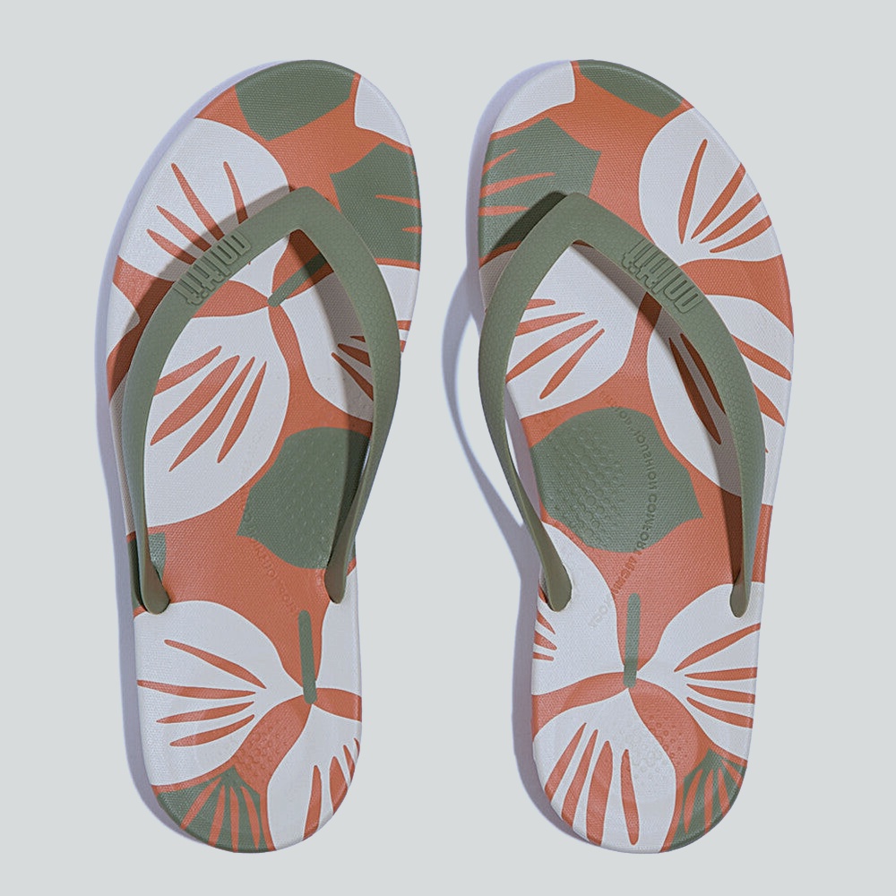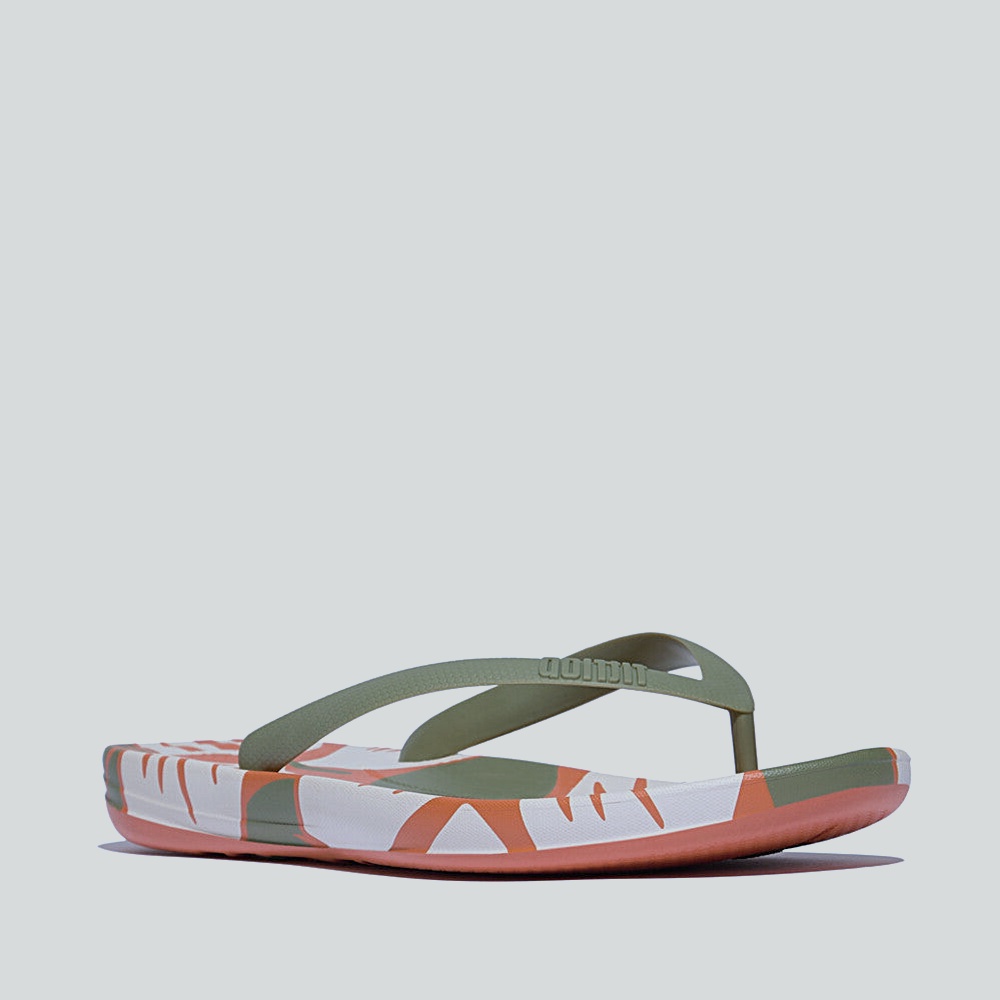 Slim V-strap flip-flops with a GeoLeaf print in olive, coral, and white. Ultra-light iQushion™ footbed cushions every step with heel/forefoot “pillows” and natural arch support. Soft toe post and smooth edges prevent rubs. Quick-dry build with a non-marking micro-grip outsole—steady from beach to street. Finished in a faded sage mix.