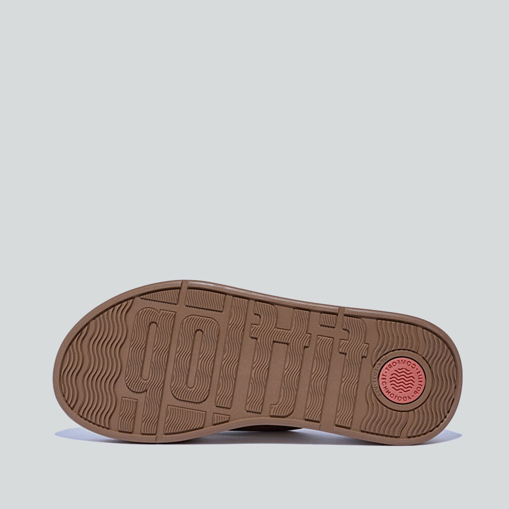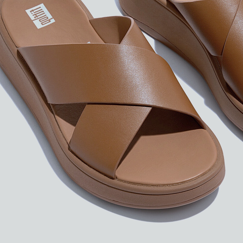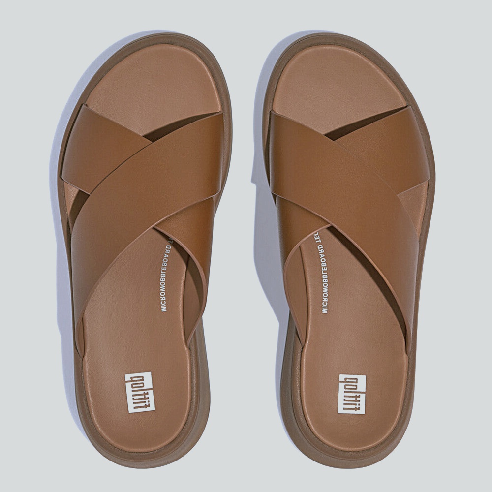 Wide crossover slide with clean, symmetric straps on a feather-light platform. CloudGlide midsole diffuses pressure and supports natural movement; contoured footbed and gentle toe-spring keep steps easy. Smooth lining prevents rubs, and a micro-grip outsole adds quiet traction in light tan.