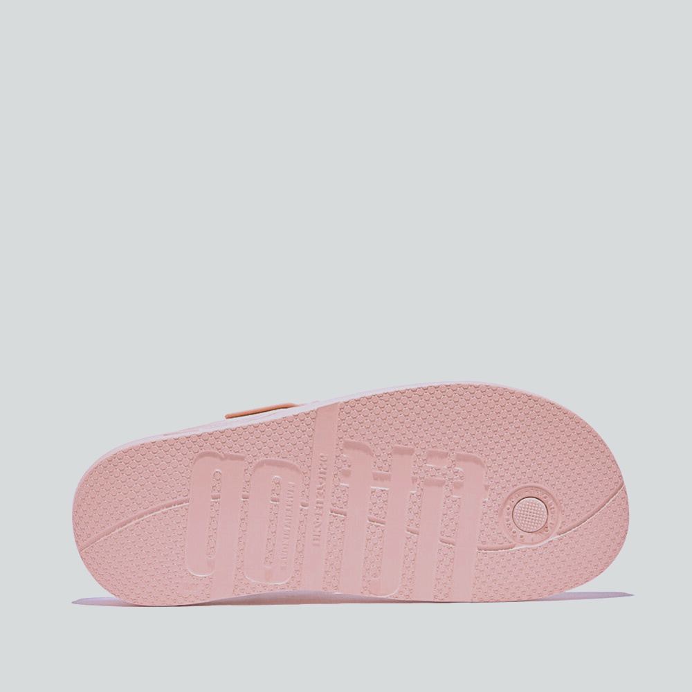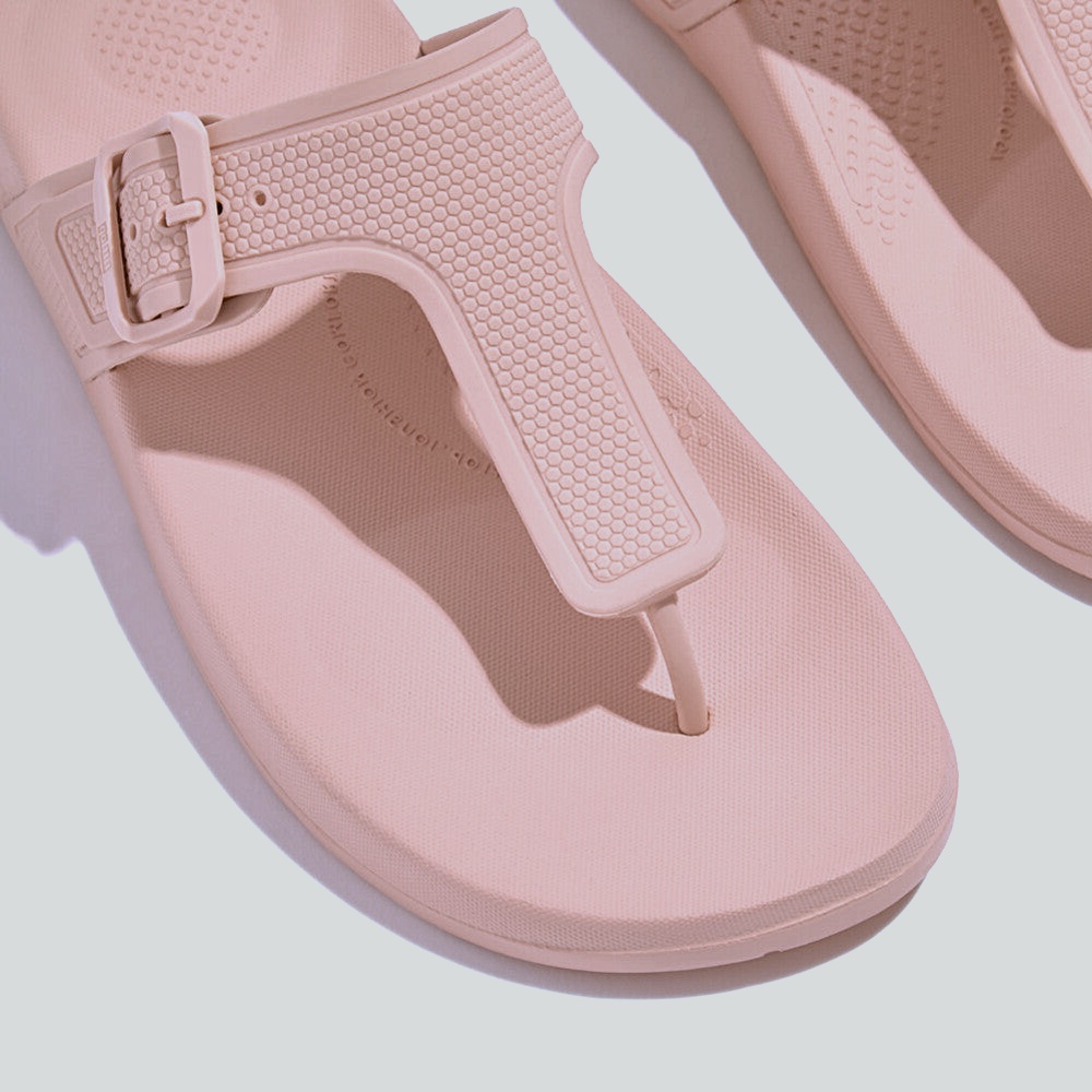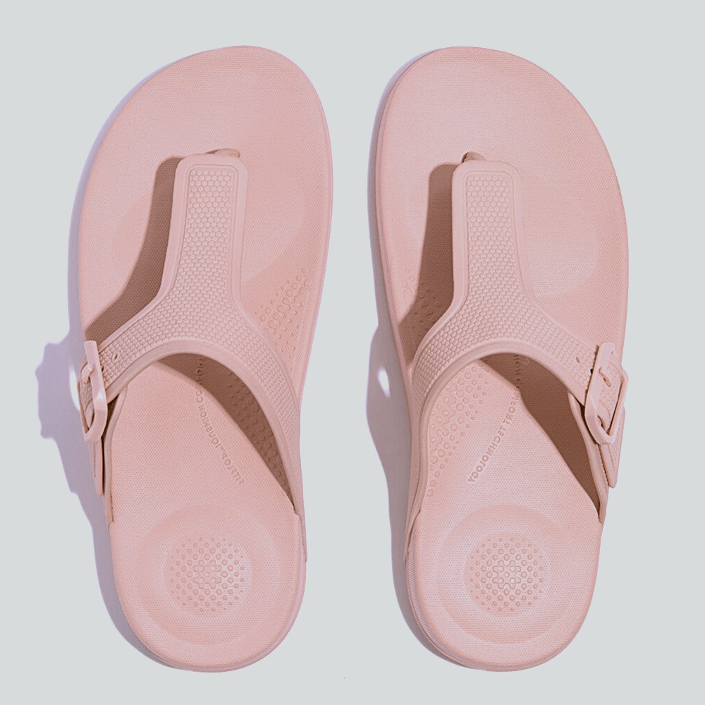 Adjustable T-strap toe-post with a soft buckle and ShieldGrid texture for structure. Ultra-light iQushion™ footbed cushions with heel/forefoot “pillows” and natural arch support. Quick-dry SplashLite build; soft toe post and smooth edges prevent rubs. Non-marking micro-grip outsole keeps steps steady in blushy fuchsia.